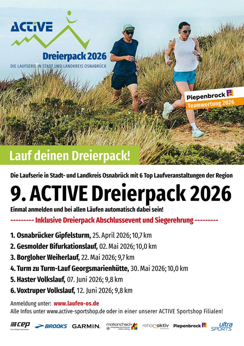Die ACTIVE Dreierpack Laufserie 2026 steht in den Startlöchern! Vom Piesberger Gipfelsturm bis Voxtruper Volkslauf erwarten euch wieder 6 tolle und abwechslungsreiche Landschaftsläufe in Serie zu denen die Anmeldung ab dem 01. November zum Frühbucherpreis von 69,-€ möglich ist. Das Teilnehmerlimit beträgt 450 Startplätze. Schnell sein lohnt sich also!